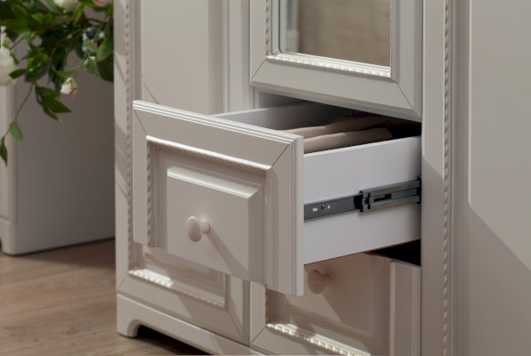 Трюмо: Корпус – ЛДСП 16 мм Фасады – МДФ с пленкой ПВХ и патиной Кромка – ПВХ 0,4 мм Направляющие – шариковые Зеркало – 4 мм Ручки – фарфоровые Опоры – пятниковые Декор – кисти для штор