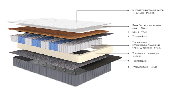 Наполнитель: ППУ, независимый пружинный блок, термовойлок, кокос