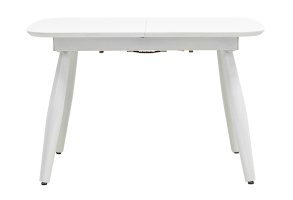 Обеденный стол раскладной. Столешница выполнена из прочного и долговечного МДФ. Светлая глянцевая поверхность столешницы гармонично сочетается с металлическими ножками. Простая прямоугольная форма стола позволит легко вписать его в современный интерьер, стол украсит кухню, гостиную или современное кафе, ресторан. Дополнительная вкладка стола выполнена из МДФ с бумажным шпоном цвета беленого дуба. На вкладке предусмотрена петля для комфортного открытия стола одной рукой.