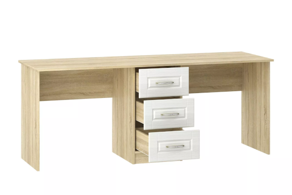 Стол НМ 041.37 Оливия предназначен для тех, кто любит практичность  и комфорт. Стол обладает модным сочетанием материалов, цветов и подчеркивает настроение детства – радость новизны и жажду открытий. Уникальная конструкция стола поможет обустроить комфортный учебный уголок, если в семье двое детей. На рабочей поверхности модуля достаточно места для размещения не только письменных принадлежностей, но и ноутбука. Закругленные углы столешницы делают эксплуатацию модуля безопасной для детей. По окончании занятий ребенок сможет убрать книги и тетради в выдвижные ящики для поддержания порядка на рабочем месте.
