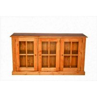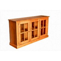 Витрина ELBA 3P. Широкая витрина-тумба с тремя остекленными дверцами и сплошной полкой. Такие низкие и удлиненные витрины предназначаются для того, чтобы выставлять на всеобщее обозрение коллекционные предметы или ценности, хотя и книжная коллекция будет смотреться в ней гармонично и естественно. Изделие полностью изготовлено из массива сосны.