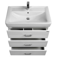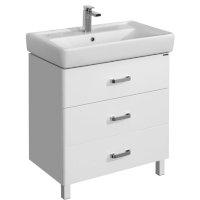 Современная лаконичная тумба под раковину AQUATON Америна 60 М с тремя ящиками имеет ширину 60 см и выполнена в белоснежном глянцевом цвете. Корпус изготовлен из влагостойкой ЛДСП, а фасад - из высококачественной МДФ. Модификация на двух изящных ножках удобна для ванных комнат, где нельзя использовать подвесную мебель. Направляющие нижнего крепежа обеспечивают жёсткое и надежное крепление ящиков, а встроенные доводчики гарантируют их бесшумное и плавное закрывание. Дополнительно организовано нижнее подключение труб водоснабжения и канализации. Корпус и фасады покрыты полиэфирной краской ультрафиолетового отверждения, обеспечивающей дополнительную защиту от влаги.