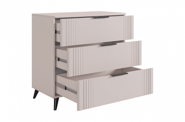 Комод изготовлен из качественных материалов: корпус выполнен из ЛДСП, что гарантирует прочность и долговечность, а фасад, выполненный из МДФ в плёнке ПВХ, не только выглядит эстетично, но и защищает комод от повреждений. Особое внимание заслуживает фрезеровка фасадов, которая придаёт изделию изысканный вид.